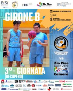 Per la seconda metà della terza giornata oggi si gioca a Turriaco al palaMarson, in piazza Lancieri di Aosta 1, per l’organizzazione di Carpe Diem. Alle 14.30 è in programma Carpe Diem Turriaco – Zio Pino Cainero Udine e a seguire, alle 16.30, K-Ros Over Fiume Veneto – Boom Baskin Latisana.