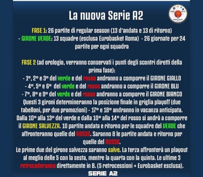 A seguito dell’approvazione della nuova formula del campionato di serie A2 maschile 2022 – 2023 da parte del Settore agonistico Fip, organizzatore dei campionati, Lega nazionale pallacanestro ha reso nota la struttura della seconda fase. E’ pubblicata in aggiornamento anche