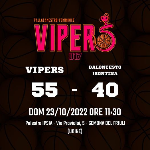 Vipers Gemona e Crich Pink Lbs Udine battono, rispettivamente, Aibi Fogliano per 55-40 e Futurosa Rosa Trieste per 59-71 e partono bene nell’Under 17 femminile Fip Fvg. Rispondono così al doppio successo triestino negli anticipi di un “cinquantello” in casa