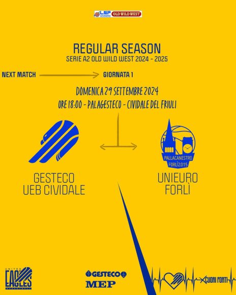 Nel rinnovato palasport di via Perusini, le Eagles della Ueb Gesteco Cividale cominciano il loro terzo campionato di A2 ricevendo l’UniEuro Forlì di coach Antimo Martino, squadra inserita tra le pretendenti alla promozione diretta. Gara prevista oggi, domenica 29 settembre,