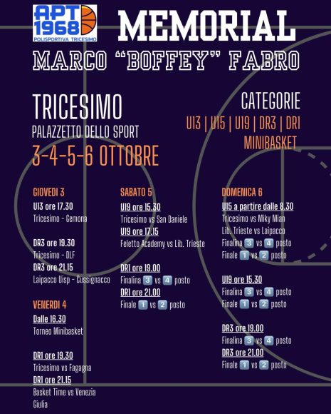 Dopo il grande successo dello scorso anno domani, giovedì 3 ottobre, prende il via il 2° memorial Marco Boffey Fabro, indimenticato vicepresidente dell’Apd Tricesimo scomparso prematuramente nel 2020. Quest’anno sarà un ricchissimo appuntamento con la pallacanestro giocata, dalle giovanili Under