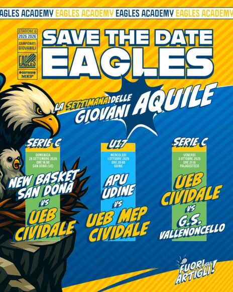 United Eagles Basketball Cividale 𝗦𝗔𝗩𝗘 𝗧𝗛𝗘 𝗗𝗔𝗧𝗘! 𝐋𝐚 𝐬𝐞𝐭𝐭𝐢𝐦𝐚𝐧𝐚 𝐝𝐞𝐥𝐥𝐚 𝐔𝐄𝐁 𝐀𝐜𝐚𝐝𝐞𝐦𝐲 𝐒𝐞𝐫𝐢𝐞 𝐂 New Basket San Donà Domenica 28 settembre, ore 18 San Donà – Venezia 𝐔𝟏𝟕 𝐄𝐜𝐜𝐞𝐥𝐥𝐞𝐧𝐳𝐚 APU Udine Mercoledì 1 ottobre, ore 20 palaCarnera – Udine 𝐒𝐞𝐫𝐢𝐞