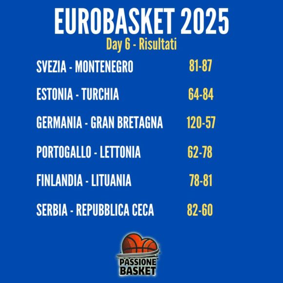 𝐄𝐔𝐑𝐎𝐁𝐀𝐒𝐊𝐄𝐓 𝟐𝟎𝟐𝟓 – 𝐃𝐀𝐘 𝟔: 𝐈 𝐑𝐈𝐒𝐔𝐋𝐓𝐀𝐓𝐈 Passiamo brevemente in rassegna i risultati del sesto giorno di Eurobasket 2025, 6 le partite disputate. Si parte con la prima vittoria di 𝐌𝐨𝐧𝐭𝐞𝐧𝐞𝐠𝐫𝐨 che ha battuto la 𝐒𝐯𝐞𝐳𝐢𝐚 per 87-81: il leader