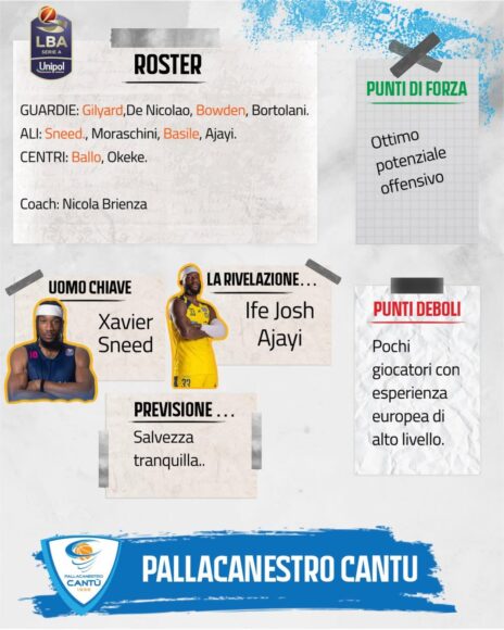 LBA 2025-2026 PALLACANESTRO CANTÙ Cantù torna in serie A dopo 5 anni con l’obiettivo di restarci e poter giocare nel tanto atteso nuovo palazzo da fine 2026. Per riuscirci il ds Santoro e il confermatissimo Brienza hanno confermato 4 giocatori