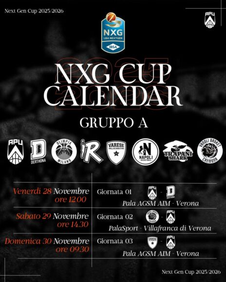 Apu Udine 𝙇’𝘼𝙥𝙪 𝙐𝙙𝙞𝙣𝙚 𝙉𝙚𝙭𝙩𝙂𝙚𝙣 𝙚̀ 𝙥𝙧𝙤𝙣𝙩𝙖 𝙥𝙚𝙧 𝙡𝙖 𝙄𝘽𝙎𝘼 𝙉𝙚𝙭𝙩𝙂𝙚𝙣 𝘾𝙪𝙥 𝟮𝟬𝟮𝟱-‘𝟮𝟲! I nostri Under 19 saranno protagonisti nel Girone , dove affronteranno Tortona, Milano, Varese, Reggio Emilia, Napoli, Trapani e Cremona. Prima tappa a Verona dal 28 al