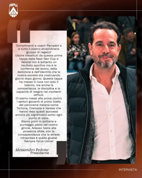 Apu Udine 𝙄𝙡 𝙋𝙧𝙚𝙨𝙞𝙙𝙚𝙣𝙩𝙚 𝘼𝙡𝙚𝙨𝙨𝙖𝙣𝙙𝙧𝙤 𝙋𝙚𝙙𝙤𝙣𝙚 𝙙𝙤𝙥𝙤 𝙡𝙖 𝙥𝙧𝙞𝙢𝙖 𝙩𝙖𝙥𝙥𝙖 𝙙𝙚𝙡𝙡𝙖 𝙉𝙚𝙭𝙩 𝙂𝙚𝙣 𝘾𝙪𝙥: “𝘾𝙤𝙢𝙥𝙡𝙞𝙢𝙚𝙣𝙩𝙞 𝙖 𝙘𝙤𝙖𝙘𝙝 𝙋𝙖𝙢𝙥𝙖𝙣𝙞 𝙚 𝙖 𝙩𝙪𝙩𝙩𝙤 𝙞𝙡 𝙣𝙤𝙨𝙩𝙧𝙤 𝙨𝙩𝙧𝙖𝙤𝙧𝙙𝙞𝙣𝙖𝙧𝙞𝙤 𝙜𝙧𝙪𝙥𝙥𝙤 𝙙𝙞 𝙧𝙖𝙜𝙖𝙯𝙯𝙞!” L’Apu Udine chiude da imbattuta la prima tappa della Next Gen Cup a