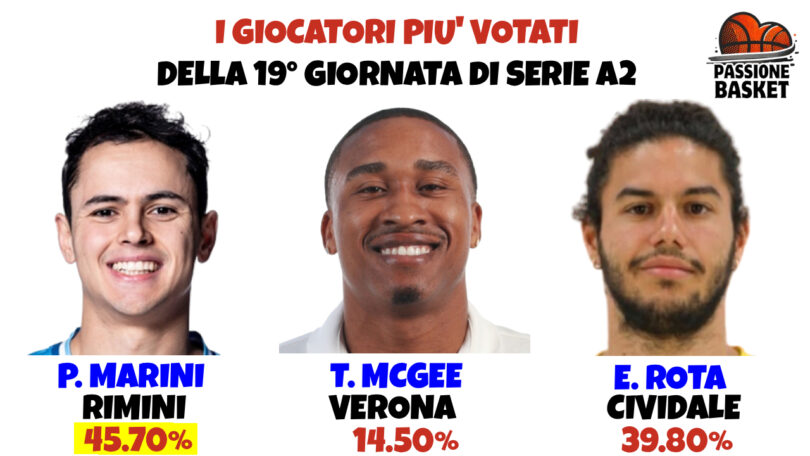 Passione Basket 𝐏𝐈𝐄𝐑𝐏𝐀𝐎𝐋𝐎 𝐌𝐀𝐑𝐈𝐍𝐈 𝐈𝐋 𝐏𝐈𝐔’ 𝐕𝐎𝐓𝐀𝐓𝐎 𝐃𝐀𝐈 𝐍𝐎𝐒𝐓𝐑𝐈 𝐅𝐎𝐋𝐋𝐎𝐖𝐄𝐑𝐒 𝐏𝐄𝐑 𝐋𝐀 𝐃𝐈𝐂𝐈𝐀𝐍𝐍𝐎𝐕𝐄𝐒𝐈𝐌𝐀 𝐆𝐈𝐎𝐑𝐍𝐀𝐓𝐀 𝐃𝐈 𝐒𝐄𝐑𝐈𝐄 𝐀𝟐 Si chiude il nostro contest sulla diciannovesima giornata di Serie A2 con tutte e 10 le gare disputate: il giocatore più votato è