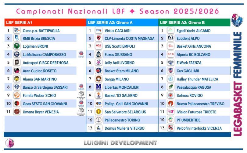 Dunque, la serie A1 femminile riparte a 11 squadre come nel campionato scorso mentre nella stagione 2025-2026 sarà l’A2F a dimagrire. Anziché, a 28 squadre suddivise in due gironi da 14 ciascuno, ne avrà sì due ma da 13. E’ questa, dunque, la maniera che Fip e Lbf hanno trovato <per trasformare una possibile complessità in un fattore positivo>. La complessità era la richiesta di riposizionamento dall’A1F all’A2F fatta da Faenza, mentre l’anno scorso l’aveva avanzata Ragusa e avevano chiuso bottega Virtus Bologna e Oxygen Roma, e le 5 rinunce su 28 squadre aventi diritto in A2F di questa estate.