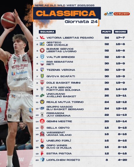 da 2^ a 7^) quarti dei play-off diretti: per Ueb Cividale, Libertas Livorno e Brindisi tutte e tre a 32 punti nell’ordine per classifica avulsa e per Rieti, Verona e Scafati, risalita dai play-in come i reatini, a 30 come Rimini scesa nei play-in; in ballo nei play-off c’è la seconda promozione in A dopo i quarti di finale, le semifinali e la finale al meglio di 5 gare con alternanza casa-casa-fuori-fuori-casa;