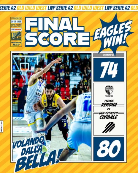 La Ueb Cividale a Verona vince al supplementare uno dei due spareggi di quota 30 della quinta di ritorno in A2, a 2 punti dalla capolista VL Pesaro. L’altro va, anche in maniera rovinosa per Rimini (-32), alla Libertas Livorno al Flaminio romagnolo. In due turni scaligeri e banda di coach Sandro dell’Agnello si vedono agganciati e scavalcati da ducali e labronici. A far loro compagnia in seconda piazza resta solo Brindisi, ripartita contro Avellino dopo lo stop infrasettimanale al palaPerusini.