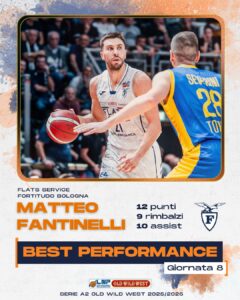 ✨ I voti dei fan Lnp hanno eletto quella di 𝐌𝐚𝐭𝐭𝐞𝐨 𝐅𝐚𝐧𝐭𝐢𝐧𝐞𝐥𝐥𝐢 di Fortitudo Pallacanestro Bologna 103 come 𝑴𝒊𝒈𝒍𝒊𝒐𝒓 𝑷𝒆𝒓𝒇𝒐𝒓𝒎𝒂𝒏𝒄𝒆 della #Giornata8 della Serie A2 Old Wild West ⚪🔵