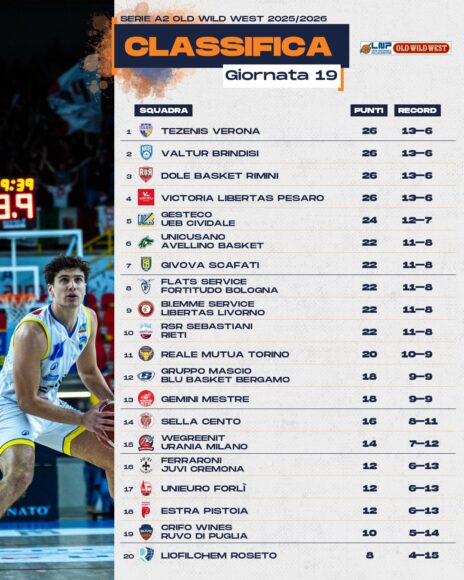 🏀 Ecco la classifica aggiornata di #SerieA2OldWildWest al termine del girone d’andata