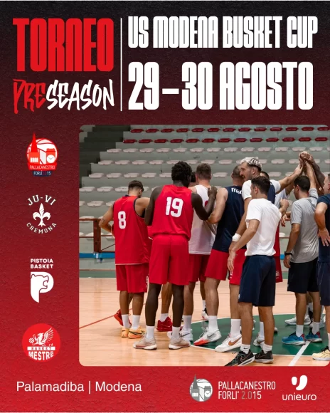 Unieuro Forlì è attesa alla US Modena Basket Cup che si disputerà al palaMadiba venerdì 29 e sabato 30 agosto. Il quadrangolare vedrà la disputa delle semifinali dalle ore 18 del venerdì, mentre le finali avranno luogo a partire dalle ore 17 del sabato. In una sorta di riedizione della finale della prima edizione della US Modena Basket Cup, i biancorossi sfideranno la JuVi Cremona, vincitrice del torneo. Nella seconda semifinale si incontreranno Pistoia e Mestre, due novità della prossima stagione di A2, con i toscani retrocessi dalla Lba e i veneti neopromossi.