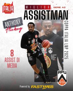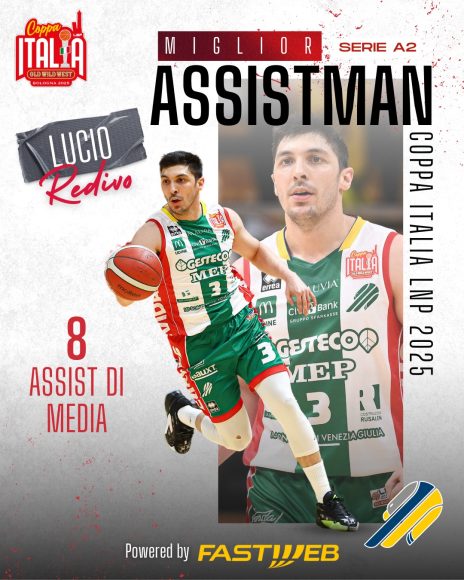 Guarda un po’ il caso, testa a testa Ueb e Apu. Noi diamo l’onore della foto di copertina a Redivo, perché di partite in Final four di coppa Italia di A2 Lnp ne ha giocate due, semifinale con Rimini e finale contro Cantù; dunque, si può davvero fare una media degli assist. Hickey, invece, ha disputato soltanto la semifinale contro la sua ex Cantù, per di più “drogata” da 5 minuti supplementari di gioco.