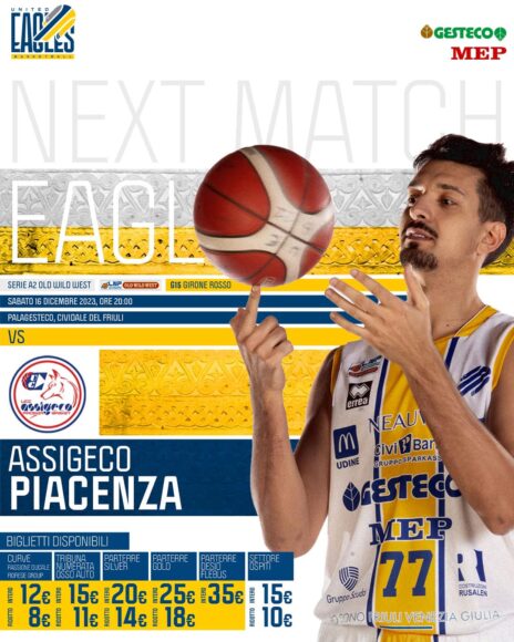 Allontanato,  speriamo definitivamente, lo spauracchio dell’ultimo posto nel girone Rosso grazie alla vittoria esterna a Chiusi con la cenerentola toscana ora distanziata di 4 punti in classifica e un 2-0 a favore negli scontri diretti, la Gesteco Ueb Cividale affronta oggi, sabato 16 dicembre, alle ore 20 per la quarta di ritorno di serie A2 al palaPerusini l’Assigeco Ucc Piacenza, arbitri Vita, Nuara e Ugolini, con la determinazione di dare continuità alla vittoria del turno precedente e cercando, nel contempo, di mantenere viva la prospettiva di aggancio dell’ottavo posto.