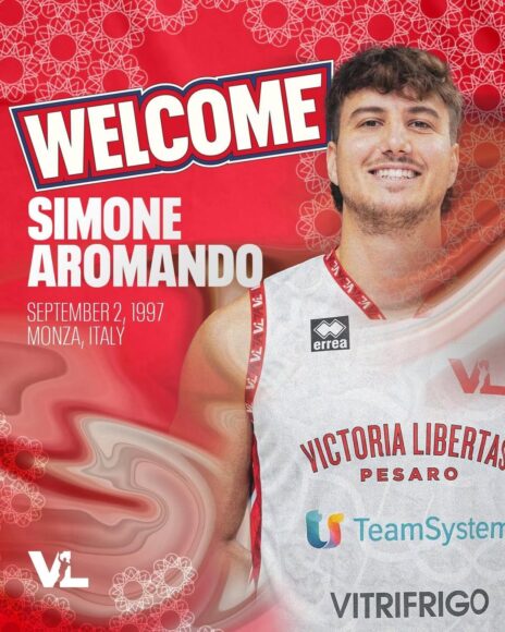 La Victoria Libertas Pallacanestro Pesaro comunica di avere raggiunto un accordo valido fino al termine dell’attuale stagione sportiva con il giocatore Simone Aromando. Ala grande, classe 1997, 200 cm, proviene dalla Gemini Mestre: in questo 2025-2026 con i veneti ha disputato 35 match con una media di 22.8 minuti, 10.3 punti e 4.9 rimbalzi per gara, oltre al 45% da due punti e il 40% da tre.