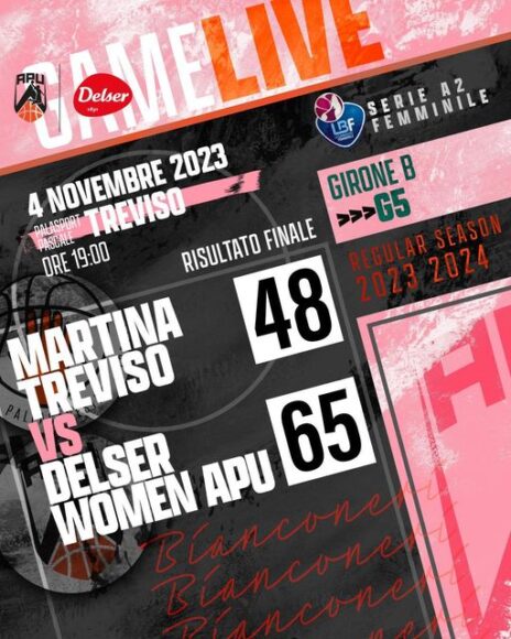 Con il punteggio di 48-65 tra le mura del Martina Treviso, la Delser Crich Lbs Udine fa cinque su cinque. Partenza lampo delle friulane che vanno a referto con tutto il quintetto e lasciano segnare alle padrone di casa solo 8 punti. Treviso però non vuole dare il là alla fuga di Udine, così accorcia le distanze con Pobozy (14 punti) e concede 8 punti alla capolista chiudendo 21-27 il primo tempo. La ripresa ha tutt’altro canovaccio. Cancelli (16 punti), Ronchi (12 punti) e Gregori sono le mattatrici del terzo quarto per il parziale di 10-22 che spalanca le porte alla quinta vittoria della squadra di coach Riga. Tuttavia, la gara non è chiusa e le trevigiane, ispirate da Perini, registrano un break di 12-0 accorciando le distanze a soli due possessi. Nei cinque minuti finali, Cancelli e Bovenzi (13 punti) regalano alle compagne il parziale di 0-12 con cui finisce la contesa. Differenza sostanziale nella gestione del possesso e nella lettura delle linee di gioco, testimoniata dal numero delle palle perse (23-15) e nel dato sui recuperi: 6-15.