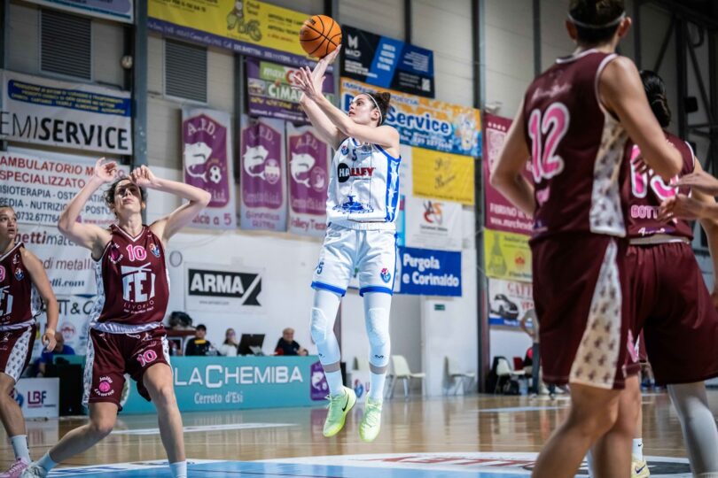 La Halley Thunder Matelica piega la Jolly Acli Basket Livorno per 69-53 nella decisiva gara3 e raggiunge Costa Masnaga in semifinale. Partono forte le padrone di casa con un parziale di 7-0 a cura di Bonvecchio (13 punti), Cabrini e Gramaccioni (18 punti con 4/6 da tre e 6 rimbalzi), le ospiti provano a reagire ma riescono ad andare a referto solo a cronometro fermo con Wojtala e Orsini (10-6); poi, la coppia di giocatrici livornesi risponde prontamente alle sortite di Gramaccioni e Bonvecchio, infine con il supporto di Botteghi (12 punti e 8 rimbalzi) si arriva sul 18-12. Nel finale di primo quarto, Fantini e Gramaccioni spostano il punteggio sul 23-14, annullando i liberi di Botteghi. L’assolo di Gonzalez (10 punti) interrompe il digiuno di canestri durato 3 minuti, registrando il massimo vantaggio casalingo sul +12, tuttavia le toscane costruiscono un break di 0-7 – protagoniste Ceccarini, Sassetti e Okodugha – che serve ad accorciare le distanze (26-21); l’inerzia del gioco torna di nuovo nelle mani di Matelica, capace di infliggere un parziale di 9-2 con i colpi di Bonvecchio, Gonzalez e Poggio (13 punti e 11 rimbalzi). La compagine livornese ha l’ultimo moto d’orgoglio prima dell’intervallo con l’asse Miccio-Georgieva, l’ultima parola però spetta a Celani (6 punti e 15 rimbalzi) che mette lo zampino sul 39-27 dopo 20 minuti di gara.