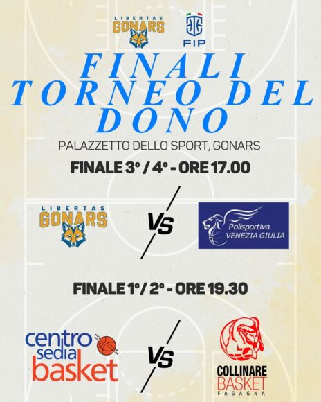 Al primo Torneo del Dono, al palasport di via delle Risorgive a Gonars, oggi sabato 13 settembre la finale per l’aggiudicazione del trofeo è tutta di serie C unica. Alle 19.30, la giocheranno il Centro sedia basket Corno di Rosazzo e la neopromossa Collinare basket Fagagna.