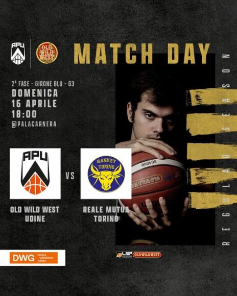 L’Old Wild West Apu Udine ospita oggi, alle ore 18, arbitri Matteo Lucotti, Marco Marzulli e Andrea Longobucco (diretta streaming su Lnp Pass e differita su Udinese Tv) la Reale Mutua Torino capolista del girone Blu di serie A2. Partita delicatissima per Udine, l’eventuale sconfitta e le concomitanti vittorie di Cividale, ieri sera, e Milano, mercoledì prossimo, pregiudicherebbero quasi sicuramente la possibile conquista di uno dei primi due posti in classifica, con la prospettiva non auspicabile di non avere il vantaggio del fattore campo nel primo turno dei quarti di finale dei play – off.