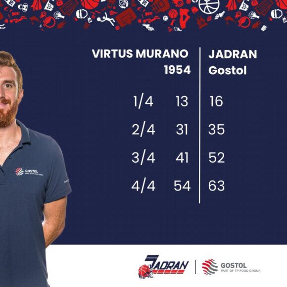 Lo Jadran Gostol Trieste ha chiuso come meglio non poteva la prima fase di serie B interregionale con la terza vittoria consecutiva, conquistata a Murano con un 54-63. Il successo non è stato tuttavia sufficiente per la salvezza, i successi