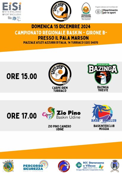 Oggi, domenica 15 dicembre, ultimo turno prima delle festività di fine anno nei tre gironi della stagione 2024 – 2025 del Baskin Fvg. Dopo tre turni nel girone A e due negli altri, si registra il primato in tutti e tre delle squadre Zio Pino Udine.