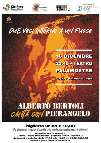 Stasera, sabato 10 dicembre alle ore 20.45 al teatro Palamostre di piazzale Diacono a Udine si terrà Alberto Bertoli canta “con” Pierangelo Bertoli, il figlio in memoria del padre morto venti anni fa e per gli ottanta anni del padre,