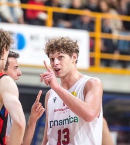 Coach Tomasi parte con Giacchè, Micalich, Perin, Ius e Fall, coach Jogan risponde con Batich, Demarchi, Gobbato, Vecchiet e Diminic. Tocca al centro croato, ex di turno, l’onore di segnare da sotto il primo canestro della gara con Perin e Fall (da tre) a rispondere per una prima frazione subito scoppiettante. Ius (nella foto nel testo) il più ispirato tra i padroni di casa, Fall, Micalich e Giacchè al 6′ firmano il vantaggio goriziano in doppia cifra sul +11 (22-11). Lo Jadran per rientrare si affida in particolare a Demarchi e risponde a una Dinamo ispirata dal perimetro (8 triple di squadra nella prima frazione) e alla sirena del 10′ il punteggio è molto alto (36-29).