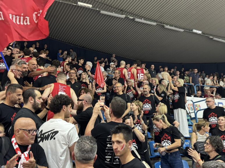 A Marchini entra nulla di nulla: 0/4 da tre. Pordenone allunghicchia a +5 (46-51). E… wonderful: sono i lunghi a dare una spallata tremenda. Gladiatorio Tio, punti (6) e rimbalzi, super Sackey ed è sorpasso estense: 52-51 al 33’. Bomba Santiago nella bolgia: 55-51. Passi di Cassese, libero di Sackey (+5). Palo di Bozzetto, cesto di Sackey: 58-51 al 35’. Go guys. Pordenone appena 2 punti in 8’, magico Chessari in acrobazia a firmare il 60-51. Che brividi. Che tifo. Che Tio: stoppa Bozzetto. L’Adamant adesso ha il sangue agli occhi, difende come una leonessa che deve proteggere i cuccioli. Ruggente. Finalmente Marchini con un tiro celestiale: 62-51 al 38’. Pordenone deraglia. Ferrara gestisce e si gusta l’apoteosi. Reggendo agli ultimi colpi di coda di un rivale che pressa e mena un filino (64-51 al 39’). Una rimonta mitica. Una vittoria grandiosa. Una promozione meritatissima. Spuntarla così c’è più gusto. Alla Bondi Arena si gode e scoppia la festa.
