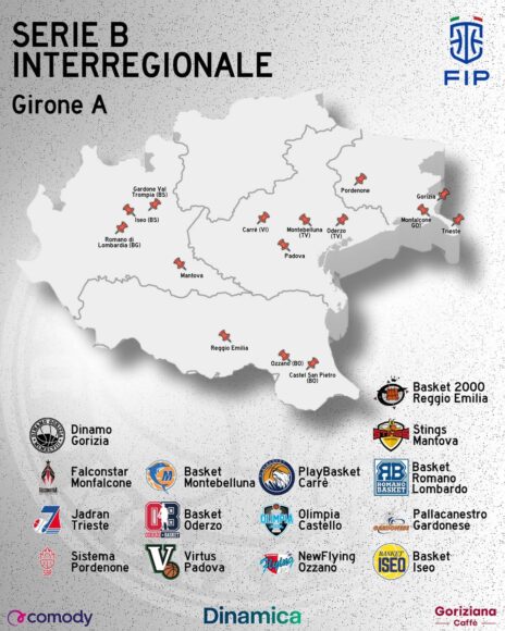 Dinamo Gorizia, con la grafica che pubblichiamo come immagine di copertina, fa da notaio al girone che avevamo postato già ieri grazie a Basket Marche. E rende l’idea dell’area geografica in cui si muoverà il campionato tra Fvg (4 squadre), Veneto (4), Lombardia (4) ed Emilia Romagna (3).