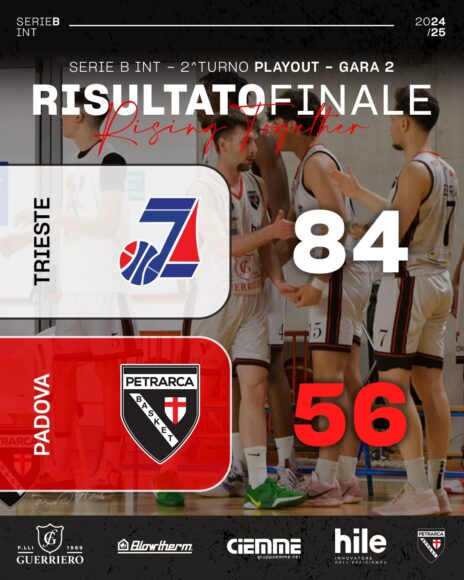Falsa partenza per i triestini in gara2 della finale salvezza. In 2 minuti tre palle perse per loro e il “diavoletto” Birra sigla tutti i punti ospiti prima del time-out (2-6). Buona risposta e per lo Jadran i punti iniziali sono tutti di Gobbato (8-6). Malalan in sospensione dà il 14-9, time-out quindi di Padova. I giuliani conservano il vantaggio a fine quarto (21-19) e allungano in avvio di secondo (29-19), contenendo bene Mwambila e Ragagnin. Si segna meno con le difese a prevalere sugli attacchi; la squadra di coach Cilio, tuttavia, dimezza il gap al 17’. È la bomba dall’angolo di Demarchi a mandare le squadre all’intervallo con un rassicurante +9 (37-28). Demarchi scatenato alla ripresa; arriva il nuovo massimo vantaggio sul 44-30. Il Guerriero non demorde, la partita si fa maschia. In ogni caso i locali si tengono sulla doppia cifra di vantaggio. Momento chiave al 29’; sigillo di Batich e poi Milisavljevic impone il +16 con cui si va alla terza sirena (57-41). Lo Jadran deve rinunciare a Karapetrović colpito duro, Padova sembra però non averne più. I ragazzi di Walter Vatovec sono bravi a creare tanti extra possessi e Demarchi firma il 68-44. Il destino del match è segnato, i vincitori controllano senza patemi e ruotano i loro effettivi.