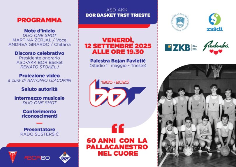 Saranno presentate le attività (programma nella locandina che pubblichiamo come immagine di copertina) della nostra società per celebrare i 60 anni della pallacanestro al Bor martedì 9 settembre 2025, alle 18, al centro sportivo Primo maggio a Trieste, Strada di Guardiella 7.