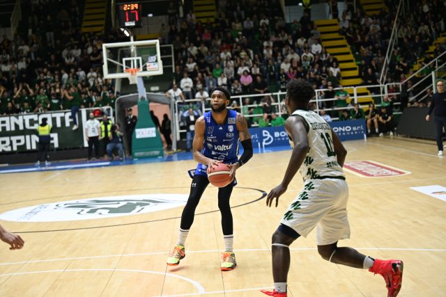 Cambia lo starting five coach Piero Bucchi schierando Radonjic dalla palla a due da ala piccola al fianco dei compagni da Calzavara–Brown–Ogden-Vildera. Partenza lampo per la Valtur con un break di 4-14 nei primi cinque minuti di gioco. Il primo quarto di Vildera, in doppia cifra a referto, e dei biancoazzurri è di ottima fattura sui due lati del campo per il punteggio di 16-25. Due canestri in fila di Arletti aprono il secondo quarto, ma la difesa di Avellino sale in intensità e contatti difensivi per porre rimedio al passivo di -14 (18-32). La squadra di casa dimezza lo svantaggio sul -7 (32-39 al 19’) prima di una nuova fiammata a opera di Ogden per il definitivo 35-44 a fine primo tempo.