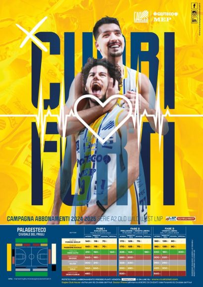 Prima “Travolgente”. Poi “Tifo Cividale… e me ne vanto”. Adesso “Per Cuori Forti”. La Gesteco Ueb Cividale ha presentato così oggi, venerdì 7 giugno, nella sede Bluenergy di Udine la campagna abbonamenti per la serie A2 2024-2025. Contestualmente ha annunciato che Grabriele Miani ha prolungato il contratto che lo lega alla Ueb fino al 2026. L’ala di Codroipo vestirà la maglia gialloblù per il quinto anno consecutivo e continuerà a essere il vice capitano delle Eagles.