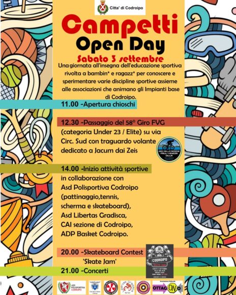 Sabato 3 settembre, alle 12.30 circa, per Codroipo passerà il 58° Giro del Fvg di ciclismo, che dedicherà un traguardo volante a Jacum dai Zeis vicino al monumento a lui dedicato in via Circonvallazione Sud. Nel corso della giornata le associazioni sportive del territorio hanno organizzato “#Campetti Open Day”una giornata all’insegna dello sport e del divertimento per bambini, ragazzi e famiglie. L’offerta della giornata e le postazioni delle associazioni sportive aderenti all’iniziativa, Libertas Gradisca, Asd Polisportiva Codroipo (pattinaggio, tennis, scherma e skateboard), Adp Codroipese, Club alpino italiano sezione di Codroipo e Associazione culturale Ottagono sono riscontrabili nella locandina qui sotto.