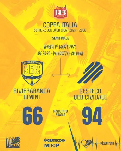 La seconda semifinale della coppa Italia Lnp 2025 di A2 targata Old Wild West si conclude con la storica vittoria della Ueb Gesteco Cividale contro la RivieraBanca Basket Rimini per 66-94. Le Eagles, che vestivano l’inedita canotta rossa, bianca e verde per celebrare la qualificazione e potevano contare sul sostegno della Marea gialla giunta a Bologna con circa 500 tifosi esultanti ed entusiasti per la serata magica, non potevano ancora fare affidamento su Martino Mastellari, che però era in panchina con la squadra. Viene ampiamente riscattata così la sconfitta di domenica scorsa (100-84 a Vigevano) e sarà finale contro Cantù vincente su Udine per la squadra nata solo cinque anni fa. Mvp del match è Giacomo Dell’Agnello: il figlio di Sandro porta a casa una prestazione da 19 punti, 9 rimbalzi, 3 palloni recuperati, 3 assist e 4 falli subiti, per un totale di 31 di valutazione.