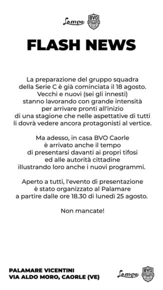 Con un’altra accoppiata centro – plyamaker nuova Niko Scodeller – Francesco Furlanis dopo gli arrivi del pivot Matteo Bettiolo e del play Giovanni Venaruzzo il Bvo Caorle ha chiuso il roster per la C unica 2025-2026. Fino al razzente Under 17 Giovanni Barbuio era alla sesta conferma a disposizione del pure confermato capo allenatore Alberto Zorzi, che avrà per nuovo vice Manuel Pennazzato. Hanno preceduto il prospetto la guardia/ala Edoardo Musco, il giocatore/allenatore U13M Pietro Coassin, il play/guardia Francesco Coassin, la guardia Luca Marzaro e il neo capitano Francesco Rizzetto.