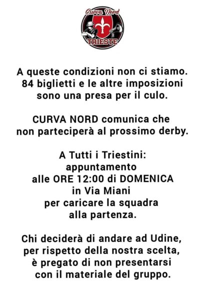 Curva Nord comunica che non parteciperà al prossimo derby.