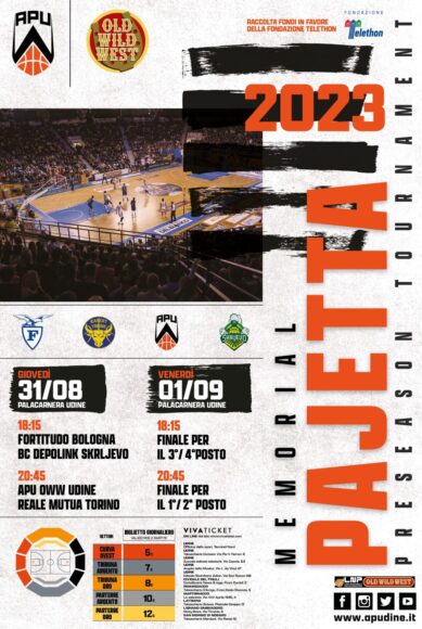 Per le finali (agli stessi orari delle semifinali) del Pajetta domani, venerdì 1 settembre, ci sarà la concomitanza a fine ritiro marino della Gesteco Ueb Cividale con il classico Lignanobasket memorial Mario Bortoluzzi trofeo Butangas al palasport di viale Europa a Sabbiadoro, che sarà presentato oggi alle ore 18 al Tenda bar di Lignano Pineta partner della prima ora delle Eagles. Il torneo sarà aperto, alle 19, dal terzo impegno della PallTS contro la Pallacanestro Forlì in una sfida tutta di A2 Rosso, seguita alle 21.15 dal debutto assoluto dei ducali contro Vigevano matricola dell’ex Leonardo Battistini di A2 Verde.