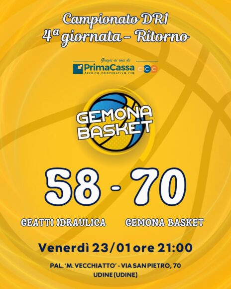 GEATTI BASKET TIME UDINE – GEMONA BASKET 58-70 (11-20, 25-32, 40-45) Arbitri Nazzi (UD) e Cisotto (UD)