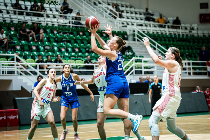 L’avvio contratto delle azzurrine le ha costrette a inseguire fin dal primo minuto. Al primo recupero sul finire del primo quarto è seguito un altro allungo della Croazia, che è andata all’intervallo lungo sul +9. Il recupero dell’Italia si è concretizzato con il gioco da tre punti di Emma Giacchetti, che ha riportato l’Italia avanti a 3 minuti dalla fine. La tripla di Arnautovic ha rimesso avanti le slave, nel finale a 5 secondi dal termine il tiro di Baldassarre che sarebbe valso il supplementare non è andato a segno.