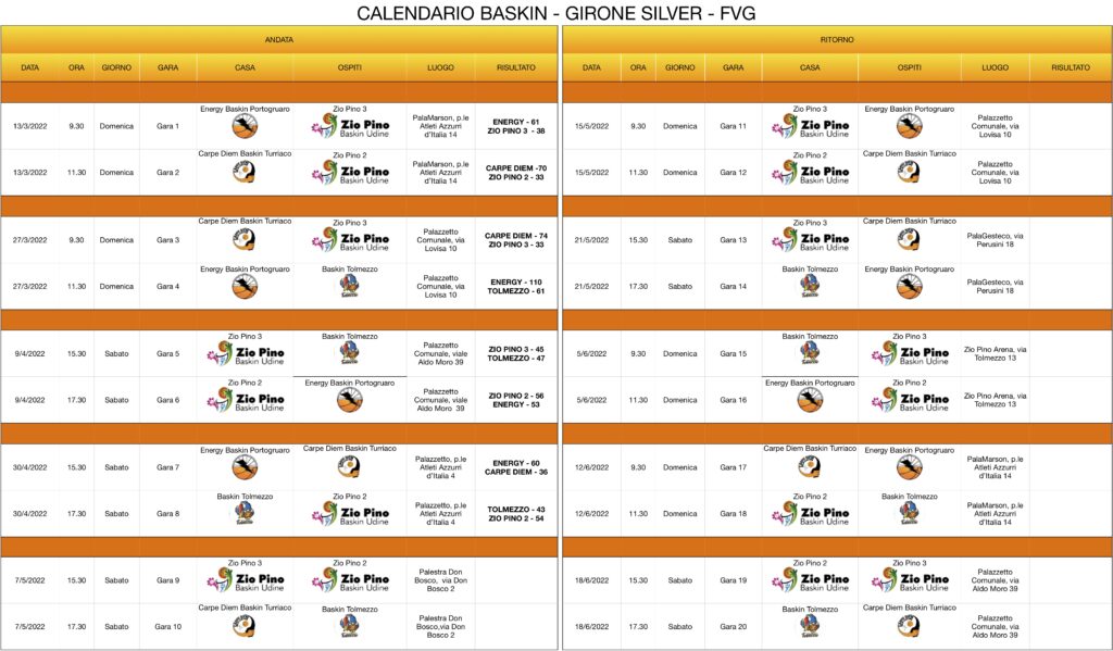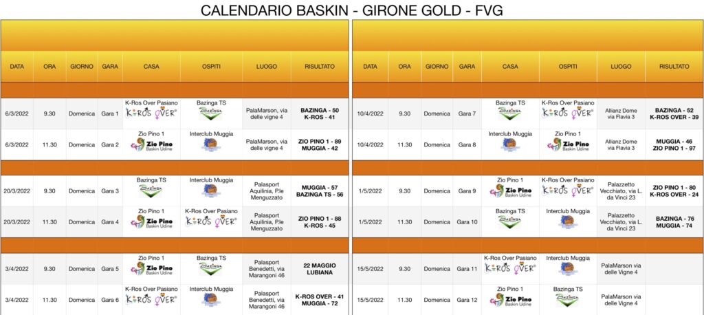 Prossimo turno. Il girone Gold tornerà in campo domenica 15 maggio per la chiusura della fase regionale a Pasiano di Pordenone, che ha già ospitato l’apertura il 6 marzo scorso. Il programma prevede, al palaMarson di via delle Vigne 4, alle ore 9.30 i K-Ros Over, padroni di casa, contro l’Interclub e a seguire, alle 11.30, Zio Pino 1Bazinga. Dopo anche il recupero tra queste ultime due squadre a Lubiana il 22 maggio, si passerà alla fase interregionale preludio delle finali nazionali del campionato di Baskin Eisi.