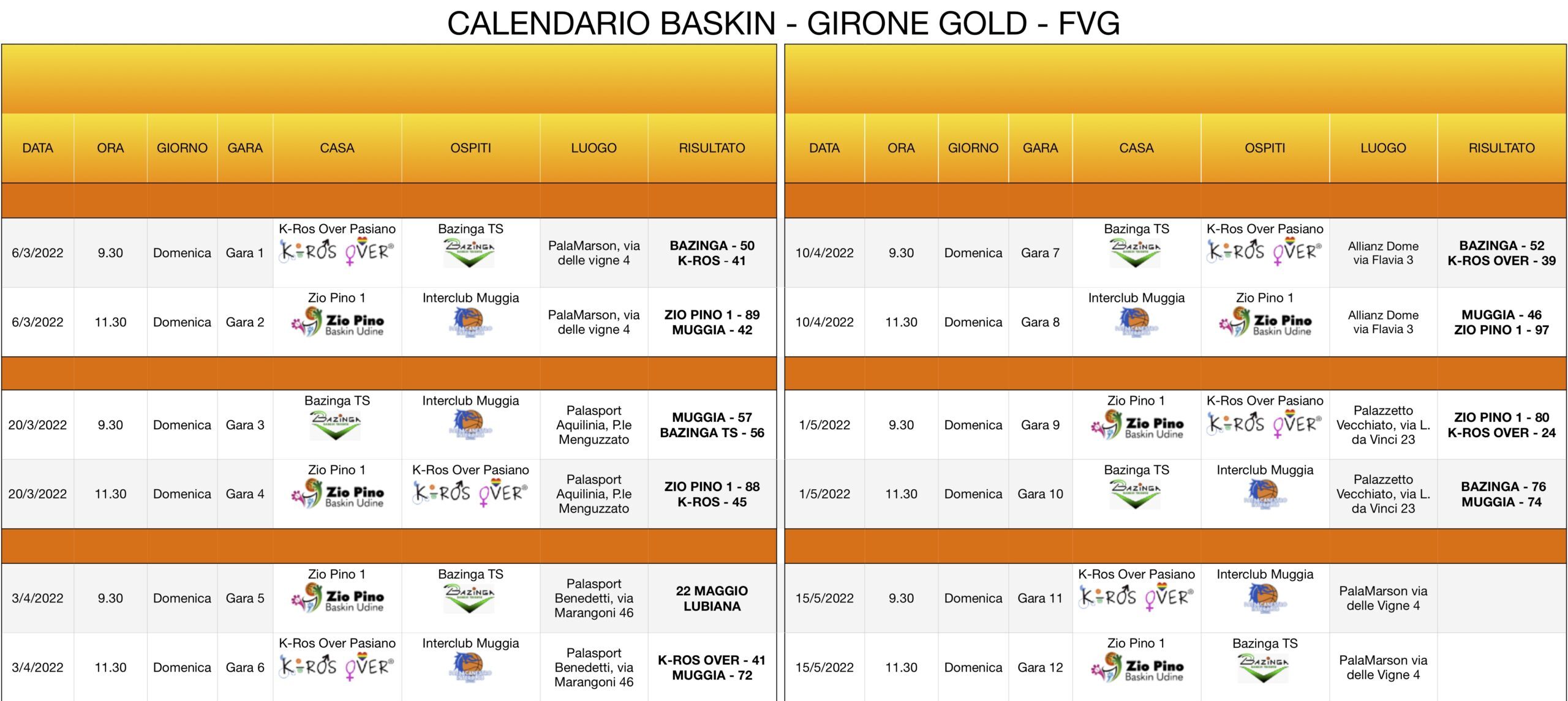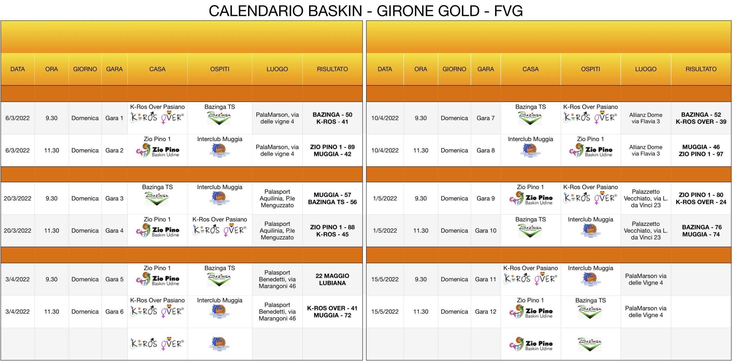 Classifica: Zio Pino 1 Udine* 12 punti; Bazinga Trieste* 10; Interclub Muggia 9;  K-Ros Over Pasiano di Pordenone 5 (ogni * una gara in meno, da recuperare Zio Pino 1 – Bazinga domenica 22 maggio prossimo a Lubiana). Nel baskin si assegnano 3 punti alla squadra vincente e uno anche a quella perdente.