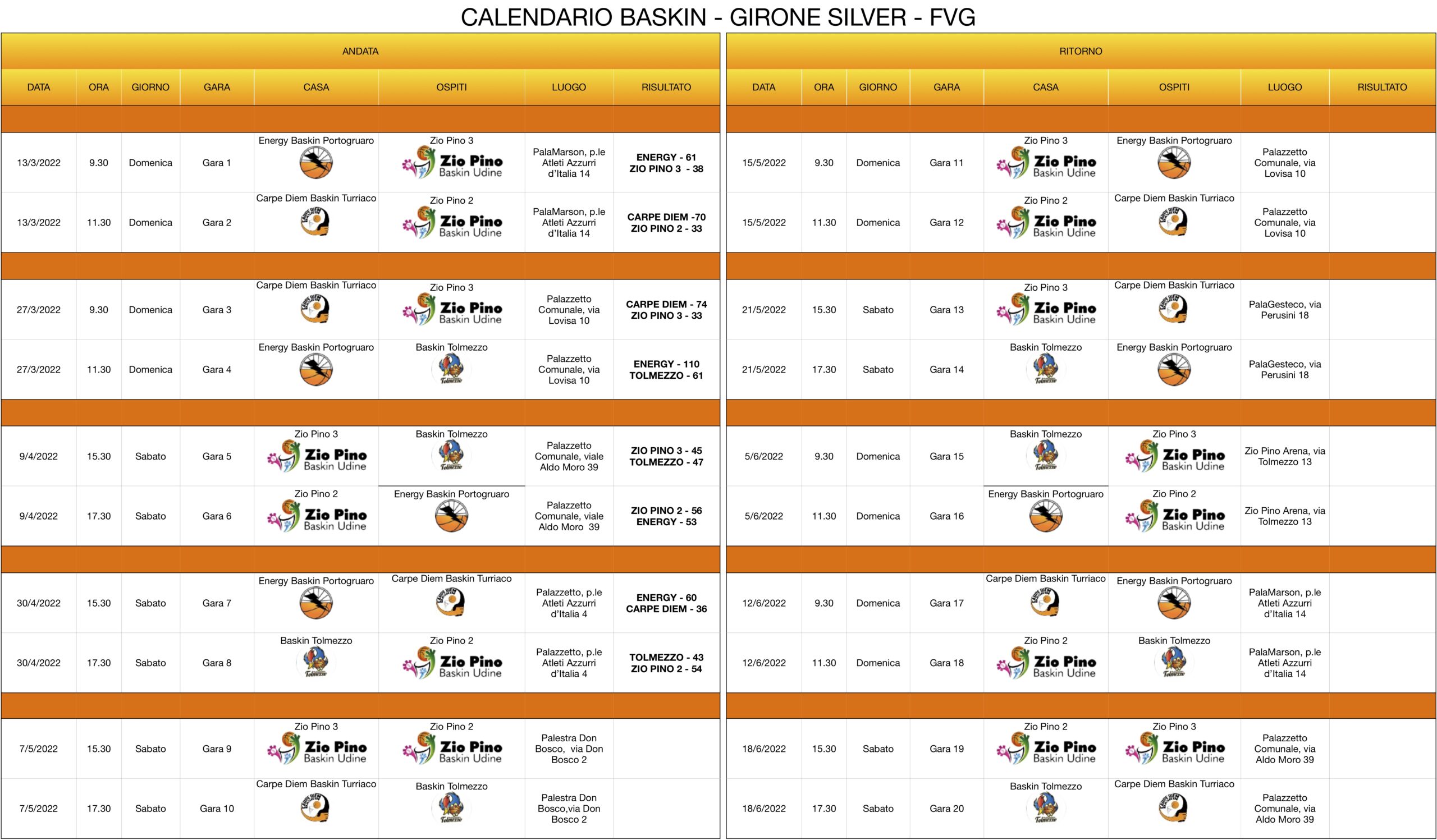 Classifica: Energy Portogruaro 10 punti; Carpe Diem Pieris-Turriaco* Percorso Sicurezza e Zio Pino 2 Udine* 7; Tolmezzo* 5; Zio Pino 3* Udine 3; (ogni * una gara in meno per turno di riposo). Nel baskin si assegnano 3 punti a vittoria e uno alla squadra perdente.