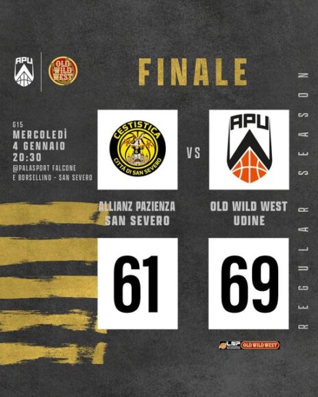 L’Old Wild West Apu Udine regala a Carlo Finetti il suo primo successo da capoallenatore in serie A2, girone Rosso dopo le due sconfitte con Forlì e a Nardò/Lecce rimediate da primo assistente incaricato di reggere la panchina bianconera durante l’assenza di coach Matteo Boniciolli ufficialmente per Covid. Vince faticando a San Severo per 61-69 (18-17, 26-31, 49-50) in volata nell’ultimo quarto, ma vince scacciando il ricordo della ricaduta in coppa Italia a Cantù/Desio ultimo atto dell’head coach triestino all’Apu dopo il fugace ritorno alla vittoria in campionato con Ferrara seguita alle tre sconfitte di fila successive al derby udinese perso a Cividale.