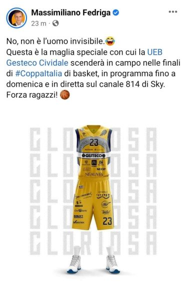 E’ stato profetico, nonché partecipe, il presidente del Friuli Venezia Giulia, Massimiliano Fedriga, alla vigilia della Final eight di coppa Italia di serie B Lega nazionale pallacanestro. Sul suo account Facebook ha scomodato l’uomo invisibile. Lui l’ha fatto pubblicando un post raffigurante la divisa dedicata con cui la Gesteco Ueb Cividale sarebbe scesa in campo nelle finali di Coppa di basket. Dava anche il canale 814 di Sky su cui potere seguire fino a domenica, scorsa, l’evento. Concludeva con un <Forza ragazzi!> da primo tifoso regionale, rivaleggiando con il meno insospettabile presidente del comitato regionale della Fip Fvg, Giovanni Adami, che anche per dovere d’ufficio si è assunto pure il ruolo d’inviato della chat BasketFvg Risultati da Roseto degli Abruzzzi.