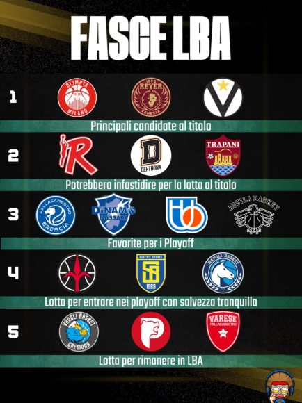 Al solito punto, aggiornato al fine settimana, di Lba Mercato questa domenica con le squadre ormai fatte abbiamo abbinato, con la grafica pubblicata in copertina, le fasce Lba messe giù sulla carta in agosto da Sport Reborn. E’ un primo tentativo di ranking, senza riscontri sul campo, delle 16 consorelle della serie A. In prima fascia quali principali candidate al titolo troviamo l’Olimpia Milano scudettata, la Virtus Bologna sua principale rivale negli ultimi anni e la Reyer Venezia abituata ai quartieri nobili della classifica. In seconda fila le prime novità che potrebbero infastidire per la lotta al titolo: la Reggiana che ci aveva abituato alle finali scudetto con la Dinamo Sassari, Derthona che con l’A2 aveva poco a che vedere e soprattutto l’ambiziosa neopromossa Trapani Shark. In terza fascia Brescia, Sassari, Treviso e Trento sono favorite per i play-off e il discorso potrebbe chiudersi qui. Invece, in penultima fila sono viste in lotta per entrare nei play-off con salvezza tranquilla Pallacanestro Trieste 2004, Scafati e Napoli. Infine, in ultima fascia la lotta per rimanere in Lba è ristretta a Vanoli Cremona, Pistoia e Varese con due su tre a rischio A2. I pronostici sono fatti per essere smentiti, ma è da notare che le matricole Trapani e PallTS non sono date in saliscendi.