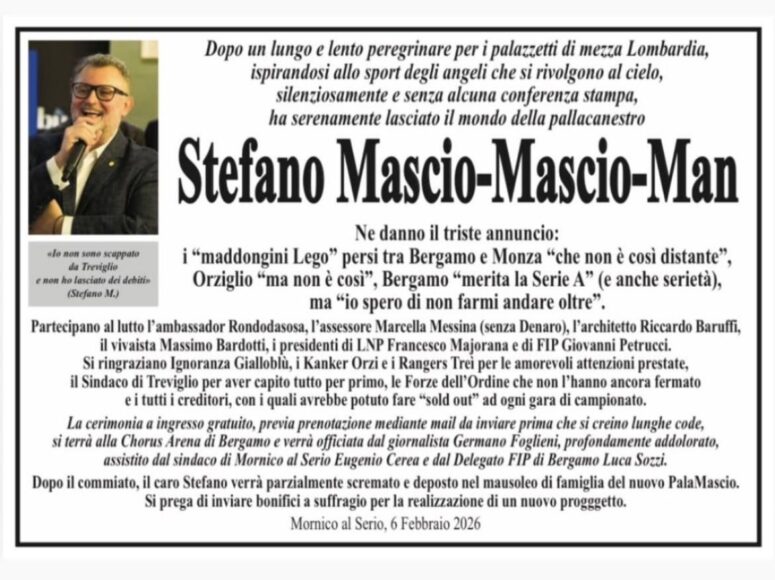 Ti contestiamo, o per lo meno non condividiamo, la tua presa di posizione – quasi a difesa – dell’ennesima pagina nera – ce lo concederai – del basket italiano. Intanto, non capiamo chi abbia e dove si sia parlato di Trapani Shark e Blu Basket Bergamo come della morte del basket in Italia, perché questo ci pare il tuo concetto di partenza. Non vorremmo che ti avesse tratto in inganno il necrologio che ripubblichiamo in copertina e non nostro, sia chiaro, ma che navigava sempre in quella <strana> comunicazione social. Leggilo bene, se è quello lo spunto da cui parti. Celebra con ironia la dipartita dal mondo della pallacanestro di Stefano Mascio-Mascio-Man, che giustamente non ritieni rappresentativo del basket italiano al pari del suo omologo Valerio Antonini.