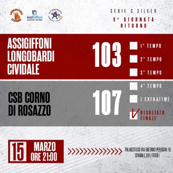 Alla fine è stata Corno a forzare i supplementari con un canestro da sotto a un secondo dalla sirena del 40′ e a mandare la partita anche al secondo overtime con un 1/2 ai liberi a 4 secondi dal 45′. Ora i Longobardi, fra neanche 48 ore, venerdì torneranno in campo nella palestra di via Udine per l’anticipo della terza di ritorno con l’Intermek 3S Cordenons, terza forza, in un’altra sfida decisiva per l’AssiGiffoni la quale è in lotta per piazzarsi nei primi sei posti che contano nella seconda fase della stagione.