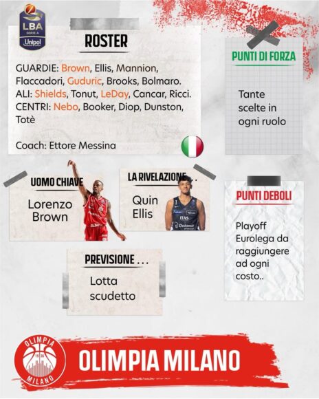 L’Olimpia Milano, reduce dalla sua peggiore stagione dal 2019, si presenta con il consueto roster profondissimo (17 giocatori senior) con il potenziale, almeno sulla carta, per arrivare in fondo in Italia e giocarsi i play-off di Eurolega. Della squadra uscita in semifinale con la Virtus è rimasto quasi tutta la quota italiana – le uscite di Bortolani e Caruso sono state compensata dall’arrivo di Ellis, l’inglese di formazione Italiana rivelazione con Trento, e di Totè, una volta che sarà guarito – mentre degli stranieri sono rimasti i tiri ignoranti di Brooks, la garra di Bolmaro, l’intoccabile Shields e la solidità di Leday. Le aggiunte estive sono state: Lorenzo Brown, il playmaker di esperienza che mancava nelle ultime stagioni; la guardia titolare del